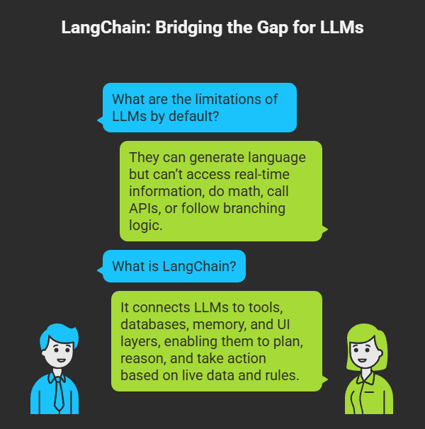 It acts as the glue between an LLM and everything else, tools, databases, memory, and even UI layers. With LangChain, you’re not just chatting with a model. You’re building smart systems that can plan, reason, and take action based on live data and defined rules.